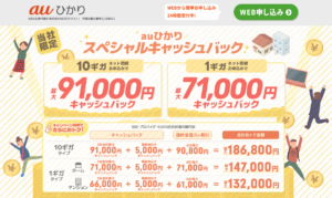 - 5.1 ①auひかり(NEXT)|91,000円が最短1ヶ月!エリア内なら最も高額なキャッシュバックがもらえる