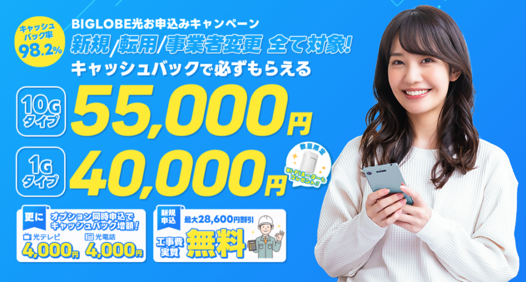 ただし、「最大〇〇万円」の最大値を狙う場合(例:auひかりで8万円など)は、一部オプションが必要になるケースもあります。